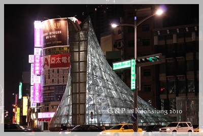 利用白色鋼管依角度排列.以三角形透明玻璃組合.形成2道逐漸爬升的弧.在高處接合.