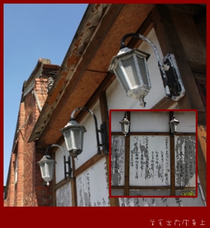 白牆上黑色書法字.很中國味.但掛燈卻又十足西洋風.卻和諧地自成一格.