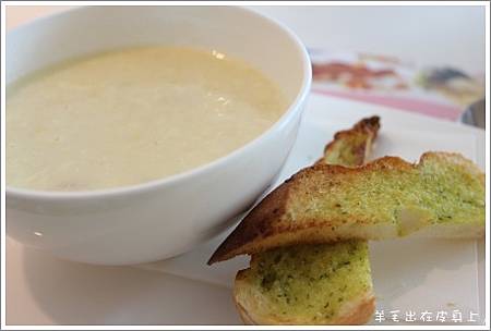 這日是奶油玉米濃湯+香蒜麵包.濃湯非常濃.味道卻不膩.調味偏清淡.麵包滋味普通.