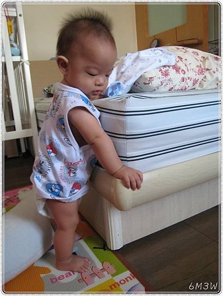 不過這天媽咪實在懶得扶他.索性讓他自己去扶著大床.高度剛好.