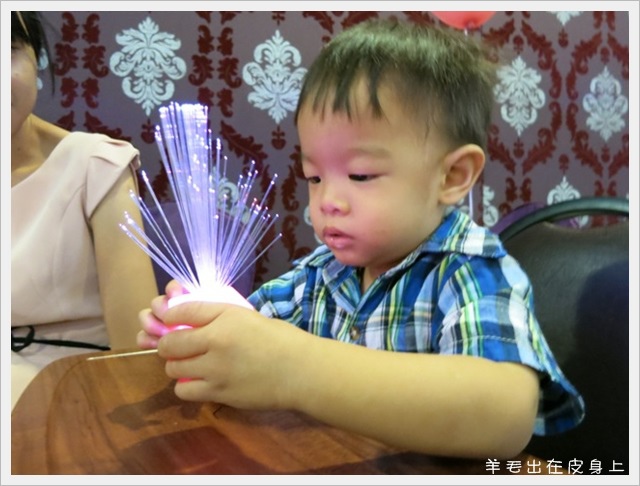餐盤上的發光小玩意讓小傢伙很好奇.不過玩不了多了.他吃了幾分飽後就趴下去睡午覺了XD