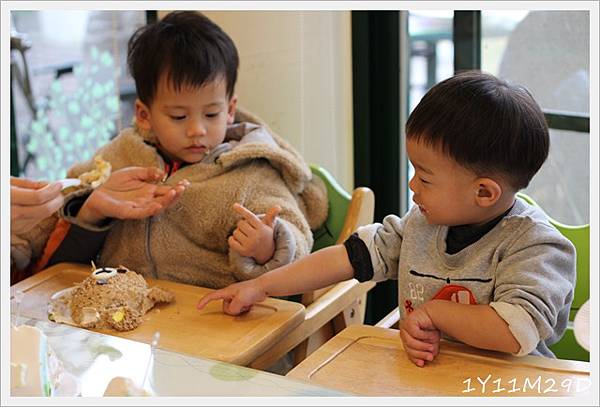 遊遊穿的熊外套跟小糰的熊蛋糕好搭.2個應該來抱一個.有如蛋糕造型般"熊抱飯糰"XD