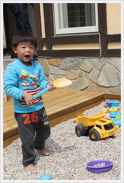 沙坑裡是顆粒的細石子.好清理不沾衣服.深得媽媽的歡心.