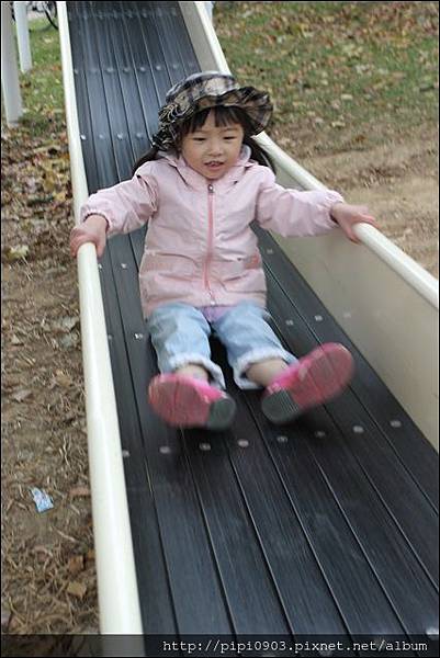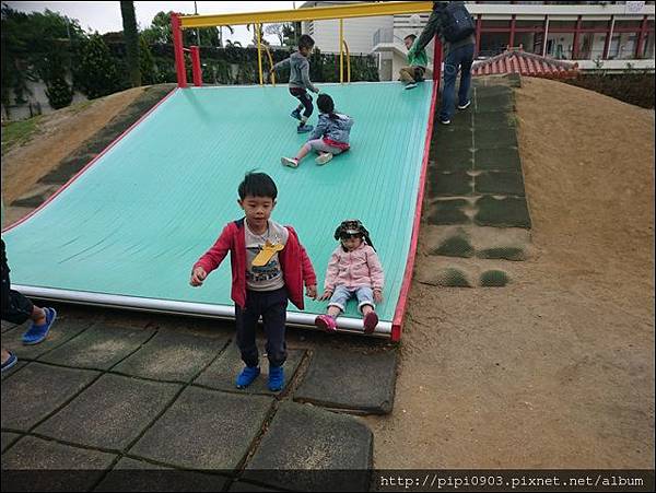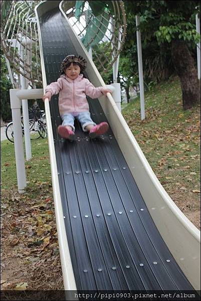 另一側小丘有個大平面滑梯.雖然長度不長但滑溜度夠.滑速快.也很好玩喔.