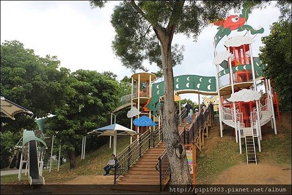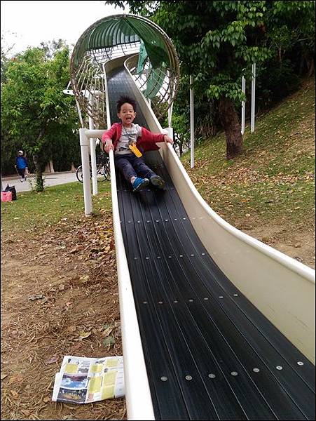 公園遊樂設施都有分齡喔.像這座山坡滑梯適用年齡6-12歲.小小孩有另一區規模較小的遊樂設施可玩.
