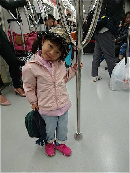 快到站時.坐不住的粉圓站起來.學起大人站著