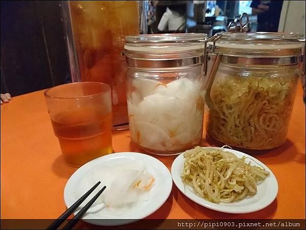 每桌提供涼拌小菜:辣豆芽及醃蘿蔔(甘口).爽脆好吃.蘿蔔連小粉圓都喜歡.吃得津津有味的.