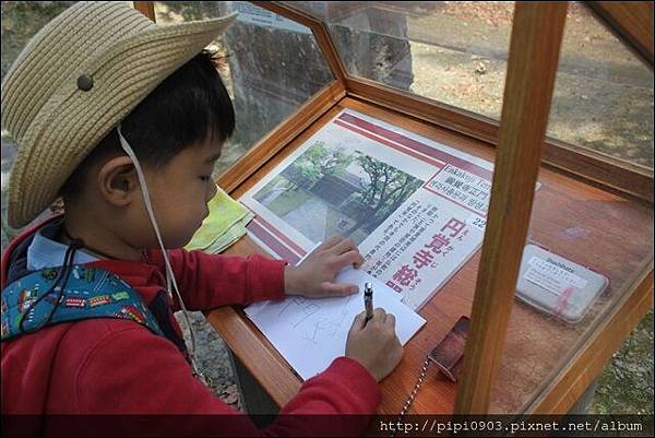 但為了提振孩子的興趣.每個主要景點/建物都有紀念章蓋章處.小飯糰掏出自己的畫冊蓋章.還拿筆筆記XD
